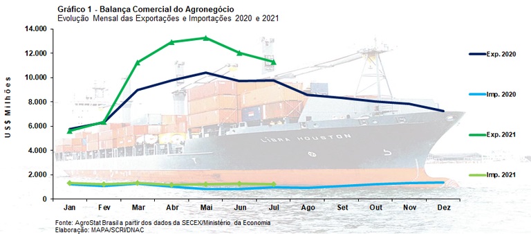 As exportações do agronegócio em julho deste ano chegaram ao valor recorde de US$ 11,29 bilhões, 15,8% superior ao exportado no mesmo mês do ano passado (US$ 9,75 bilhões).