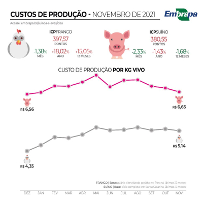Os custos de produção de frangos de corte e de suínos recuaram em novembro segundo os estudos publicados pela CIAS, a Central de Inteligência de Aves e Suínos da Embrapa. O ICPSuíno baixou 2,23% em relação a outubro, recuando para 380,55 pontos. Já o ICPFrango caiu 1,38%, fechando o mês de em 397,57 pontos.