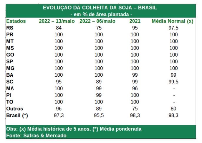 A colheita da safra de soja 2021/22 do Brasil está em 97,3% da área total esperada até a última sexta-feira (13), de acordo com levantamento da consultoria Safras & Mercado. Na semana anterior a colheita estava em 95,5%.