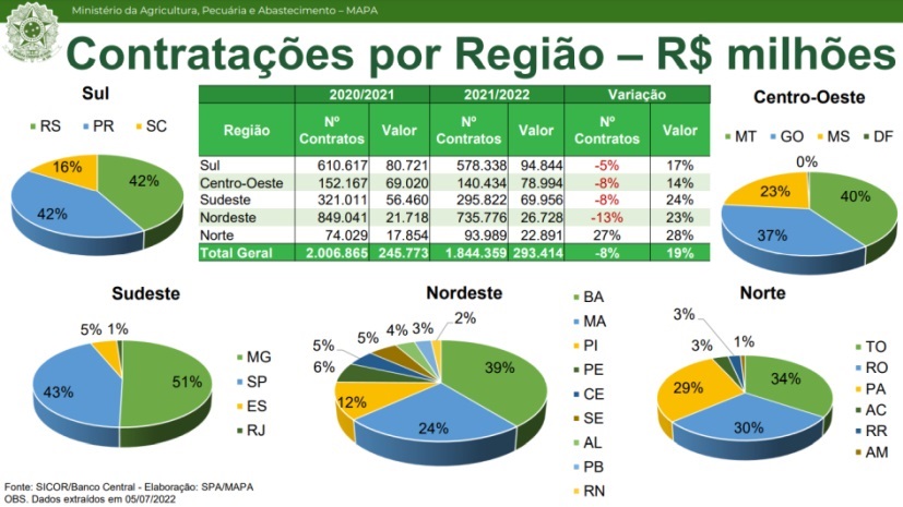 O total das contratações de crédito rural na safra 2021/22 superaram em R$ 42,19 bilhões o que foi inicialmente disponibilizado em junho/2021 (R$ 251,2 bilhões), se situando em R$ 293,41 bilhões, um aumento de 19% em relação à safra anterior. O desempenho favorável ocorreu apesar de as operações de crédito rural com recursos equalizáveis terem permanecido suspensas durante quatro meses, exceto para custeio no âmbito do Pronaf.