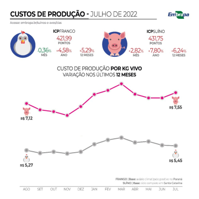 Os custos de produção de suínos subiram em julho segundo os estudos publicados pela CIAS, a Central de Inteligência de Aves e Suínos da Embrapa (embrapa.br/suinos-e-aves/cias). O Índice de Custo de produção de Suínos, o ICPSuíno, subiu 2,82% em relação a junho, fechando em 431,75 pontos. Já o ICPFrango voltou a cair, desta vez 0,36%, fechando julho em 421,99 pontos.